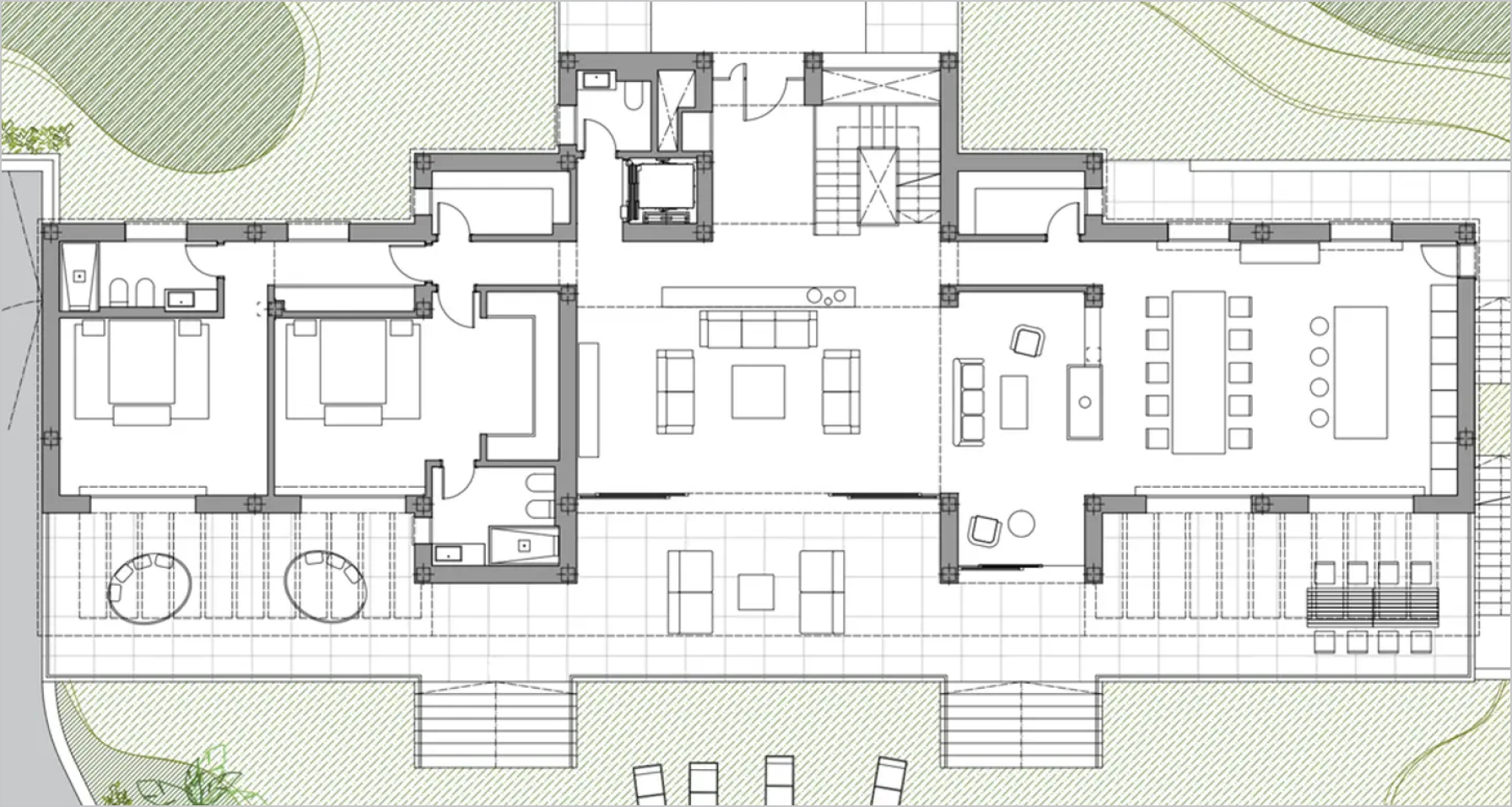 Upstairs, ascending the stairs we find a distribution space to the bedrooms, where each one has a private bathroom and an integrated dressing area, being the master bedroom independent. The secondary bedrooms also have a space for work, either a study area or an office in the anteroom of the bedrooms that separate the sleeping area from the work area. In the master bedroom there is also a space that can be used as an office or dressing room.